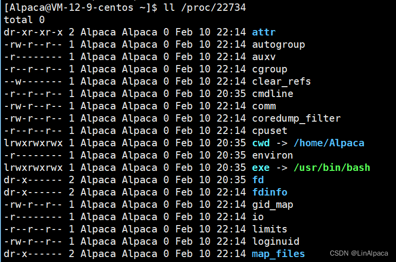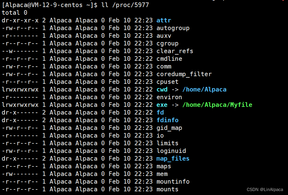 🥖第二种方法则是直接在系统文件夹之下查找,我们事先得到进程的 PID 之后,在 proc 文件夹下找到目标进程的目录,便可以看到该进程的具体属性。