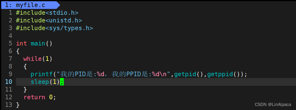 🥖同时我们还可以通过系统调用来获取进程的 PID 跟 PPID ,只需要将代码修改一下,包上头文件