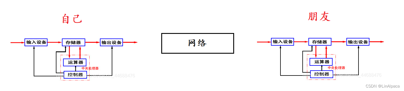 🥖那我们在网络中与他人交互时,数据流是怎样流动的。就拿QQ/微信举例吧,当信息从聊天框发送出去之后,便被加载到了内存之中,经过计算之后通过显示屏输出呈现给我们,并通过网卡将数据传给朋友,朋友的网卡接收了网络上的数据,并将其加载到了内存之中,经CPU计算后在显示屏上输出,如此便完成了信息的传递。