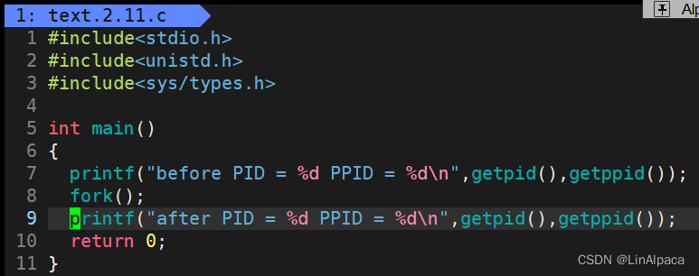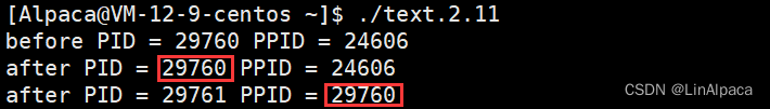 🥖像这样修改代码之后,可以观察到最后的打印出现两次,说明此时为两个进程,而 PID 与 PPID 恰好说明二者是父子进程的关系。