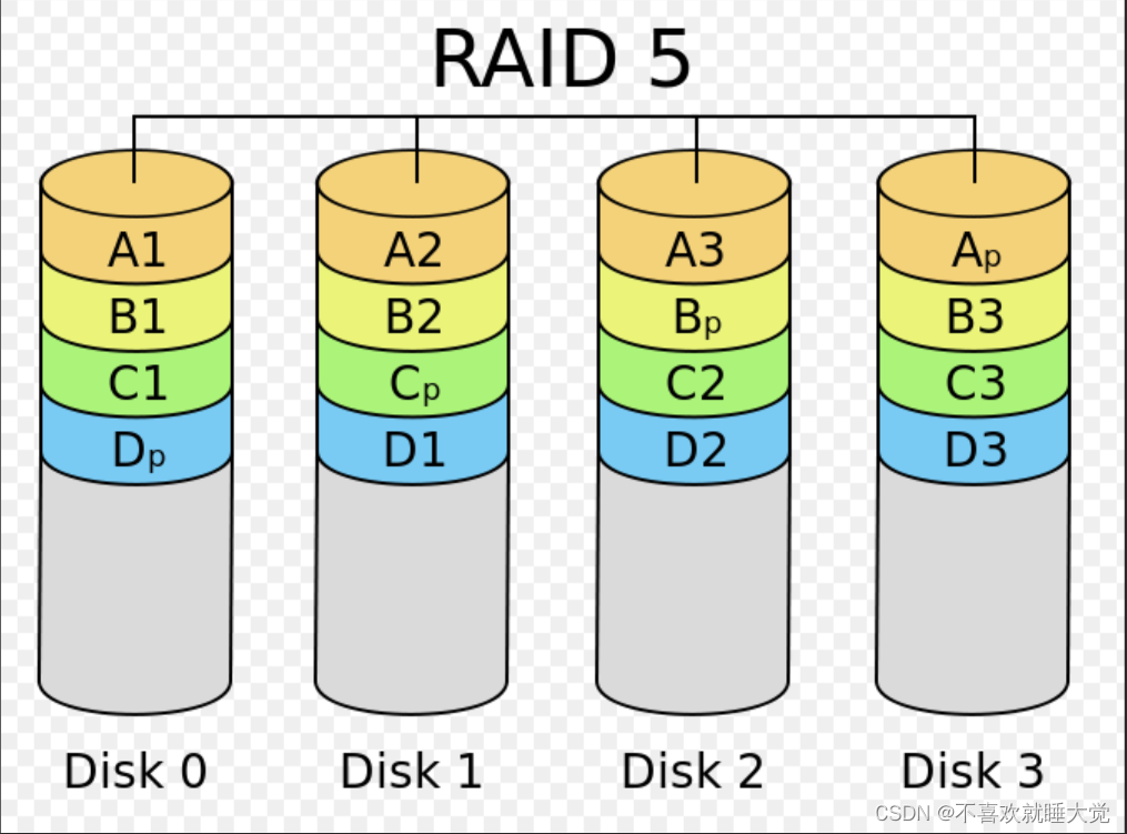 RAID 5至少需要三块盘,并将每个块分别存储在不同的硬盘上,实现了数据的并行读写。这样可以显著提升读写性能,因为系统可以同时从多个硬盘读取或写入数据。