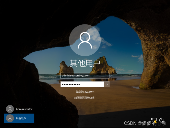 当Windows 10客户端加入到域并重新启动后,会显示选择用户登录界面,单击【其他用户】按钮,打开Windows 10登录域界面。在【用户名】文本框中输入欲使用的域用户账户,其格式是:“用户名@域名”或“域名\用户名”,例如 Administrator@xyz.com xyz.com\Administrator,此时提示信息会显示要登录到的域。在【密码】文本框中输入密码,单击【登录】按钮或按 Enter键即可登录到域,如图所示。