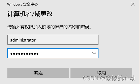 (4)系统提示请输入有权限加入该域的账户的名称和密码,如图所示。域控制器的系统管理员具有该权限,或者被委派将计算机添加到域权限的用户也具有该权限。