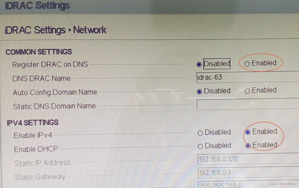 重启计算机,依照屏幕显示按F2进入SystemSetup。选择iDRACsettings – Network,需要改动的如下(现在已经不再使用DHCP):