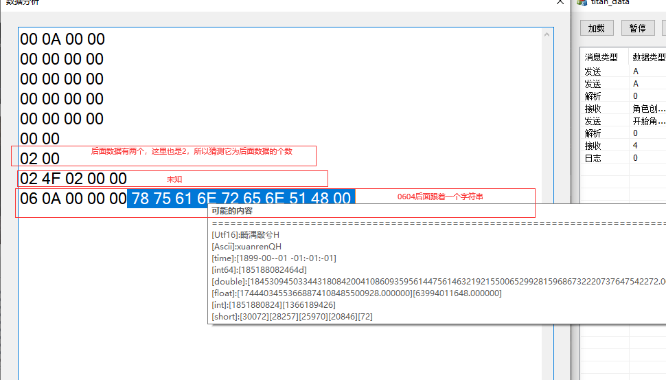 接下来使用程序把字符串解读出来,上方数据包解读翻译的内容如下图,看不出是什么来,它就先不分析了