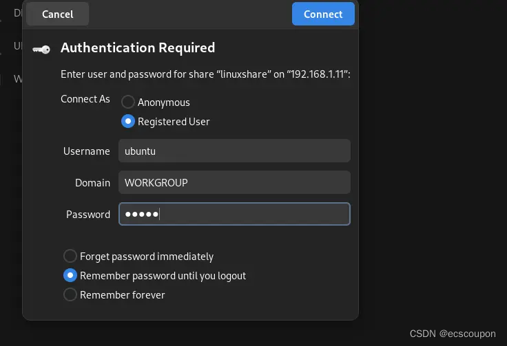 当我们连接时,服务器要求我们输入添加到 SAMBA 组的凭据或用户和密码。