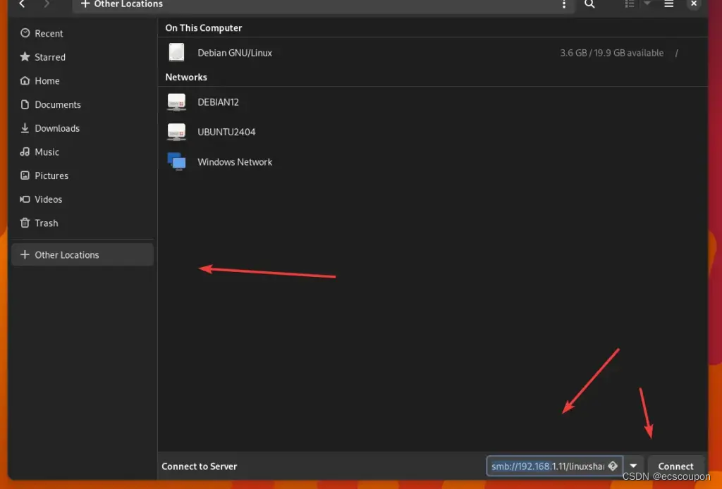 ⇒ 在那里,转到连接服务器框并按照以下格式输入您的Ubuntu 24.04 Samba IP 地址: