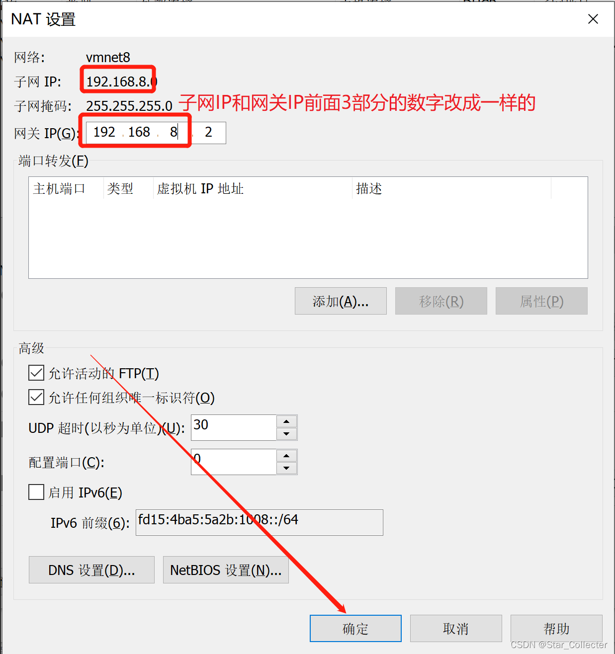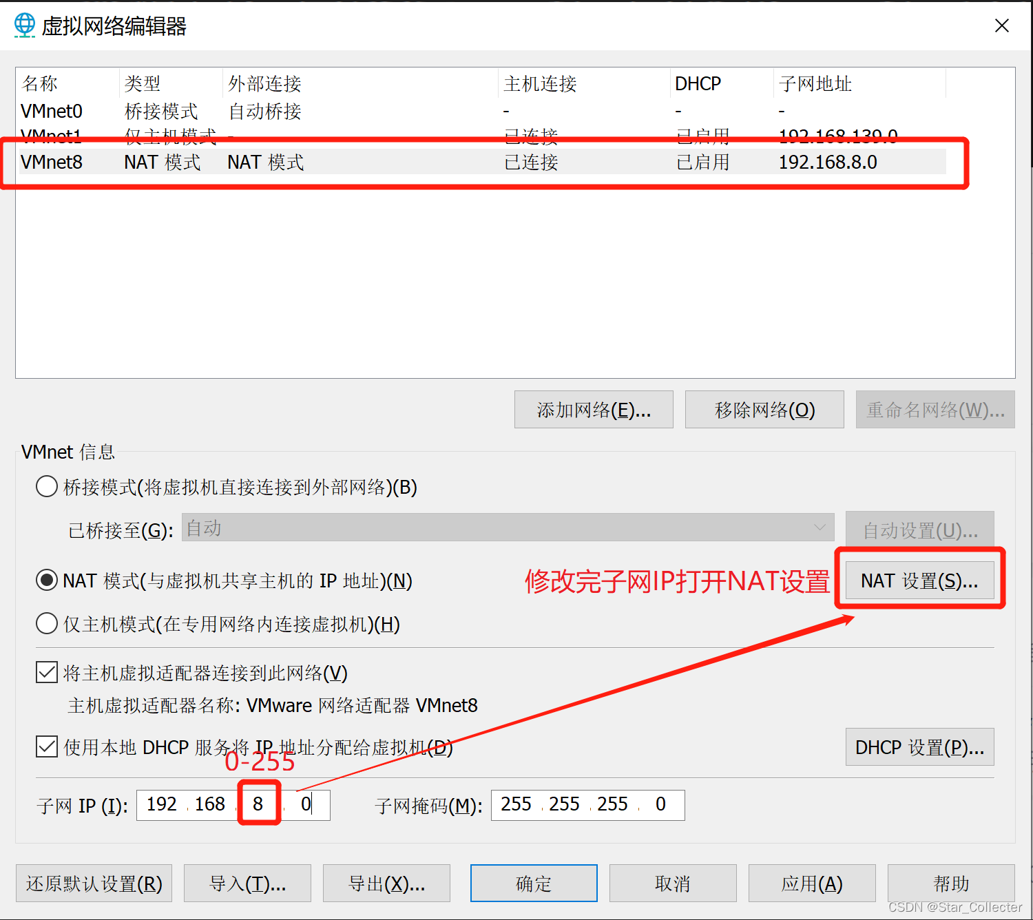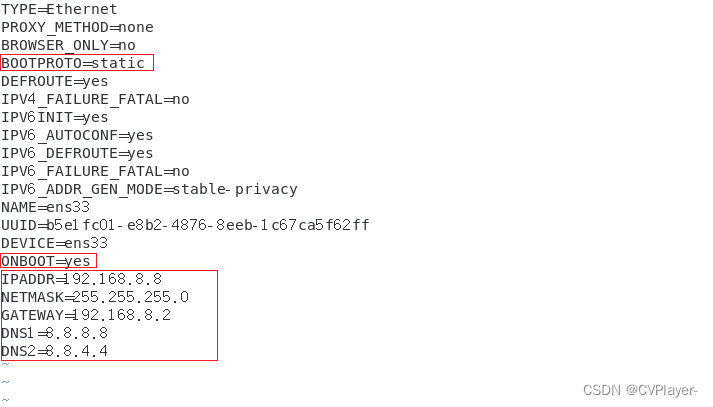 BOOTPROTO=static ONBOOT=yes IPADDR=192.168.xxx.xxx #前三部分设置为第3步中设置的子网IP,第四部分0-255任意一个数,设置好后这个就是虚拟机的静态IP地址 NETMASK=255.255.255.0 GATEWAY=192.168.xxx.2 #设置为第4步中设置的网关IP DNS1=8.8.8.8 #Google域名服务器 DNS2=8.8.4.4 #Google域名服务器