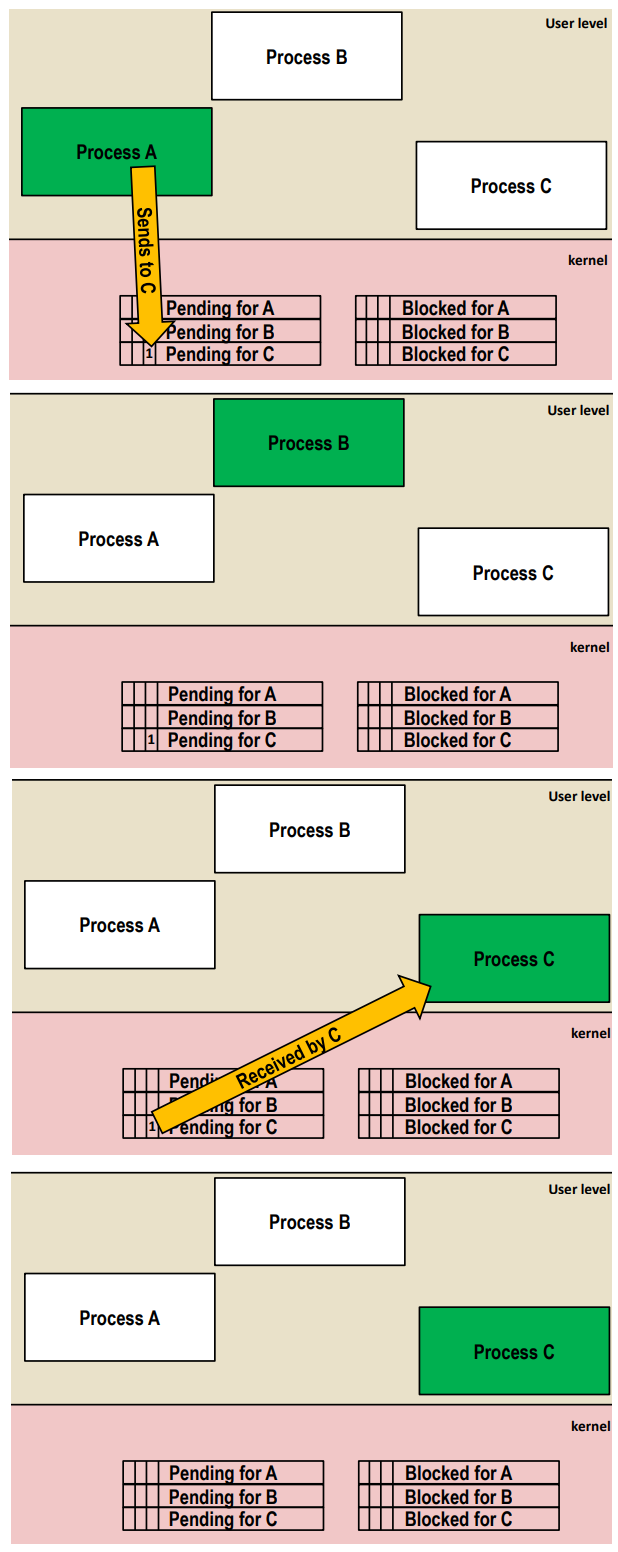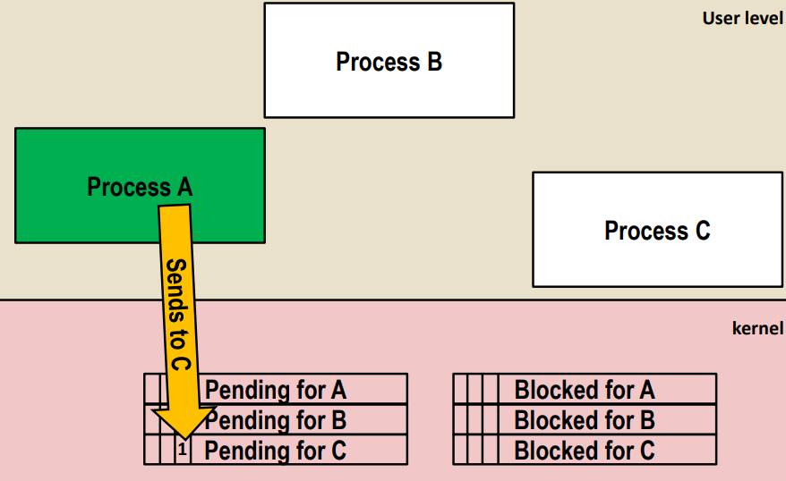 内核通过更新目标进程的上下文状态向 目标进程 (destination proces) 传递 (send) 信号。