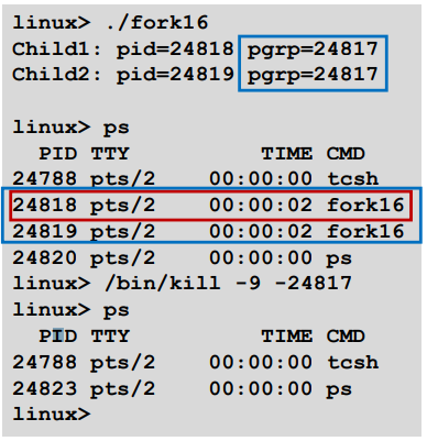 kill -9 24818 向进程24818发送SIGKILL 相当于以下内容: kill -SIGKILL 24818 kill -9 -24817 向进程组中的每个进程发送SIGKILL 进程组中的每个进程24817