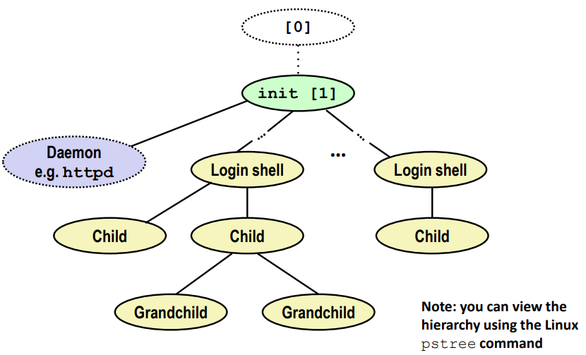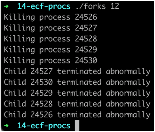 void fork12() { pid_t pid[N]; int i, child_status; for (i = 0; i < N; i++) if ((pid[i] = fork()) == 0) while (1); /* Child: Infinite Loop */ for (i = 0; i < N; i++) { printf("Killing process %d\n", pid[i]); kill(pid[i], SIGINT); } for (i = 0; i < N; i++) { pid_t wpid = wait(&child_status); if (WIFEXITED(child_status)) printf("Child %d terminated with exit status %d\n", wpid, WEXITSTATUS(child_status)); else printf("Child %d terminated abnormally\n", wpid); } } 🚩 运行结果如下:(当 N = 5)