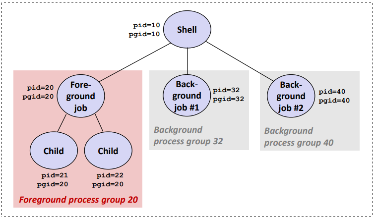 输入 ctrl-c(ctrl-z)会导致内核向前台进程组中的每个工作发送 SIGINT(SIGTSTP)