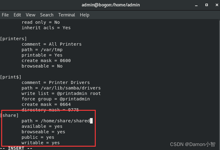 su share #切换用户为我们刚刚创建的share用户 mkdir share #创建共享文件夹share chmod 777 share #为共享文件夹设置全权限 Samba 的配置文件包含了服务的各项设置。我们备份了默认的配置文件,并通过 vi编辑器 打开了配置文件,向其中添加了我们创建的共享文件夹的配置。