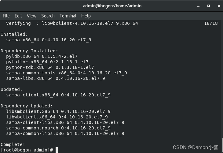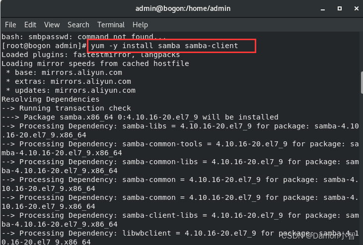 首先,我们通过 yum 包管理工具在 CentOS7 系统上安装 Samba 服务。