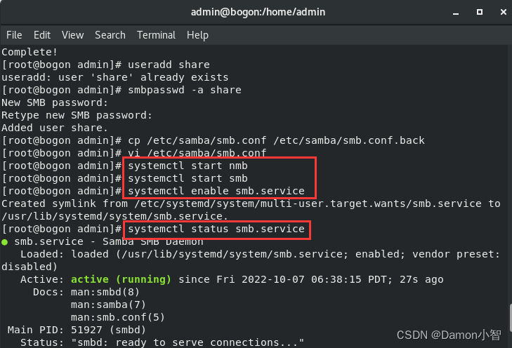 systemctl start nmb #启动nmb服务 systemctl start smb #启动smb服务 systemctl enable smb.service #设置smb服务为自启动 systemctl status smb.service #查看smb服务的开启状态