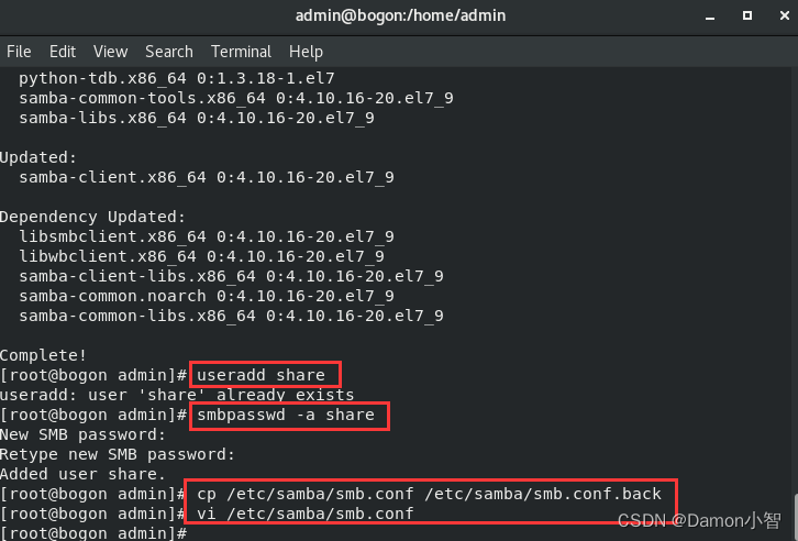 useradd share #创建用户share smbpasswd -a share #为新用户share设置密码