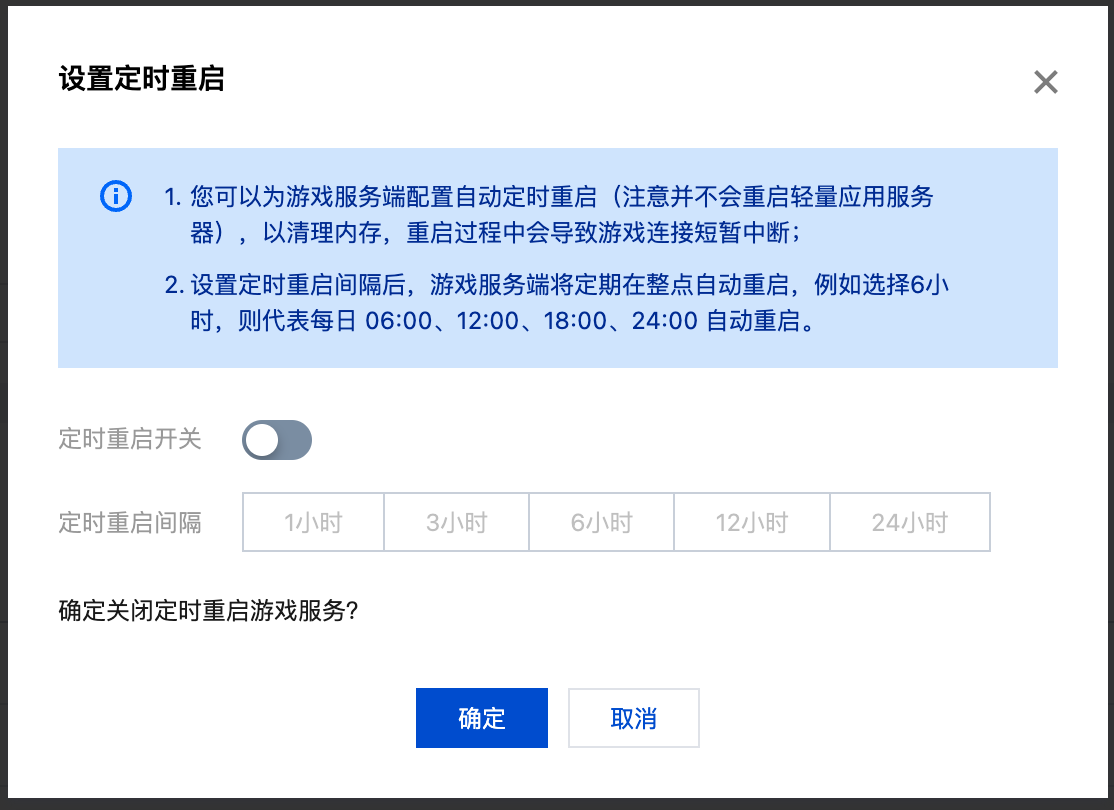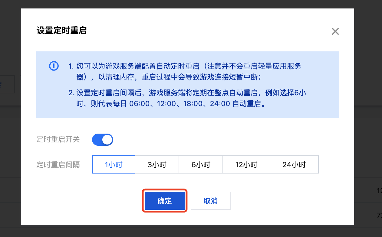 2、单击游戏管理面板内的【设置定时重启】按钮,在弹出的弹窗中选择是否开启定时重启,并按提示输入数字设置重启时间间隔。