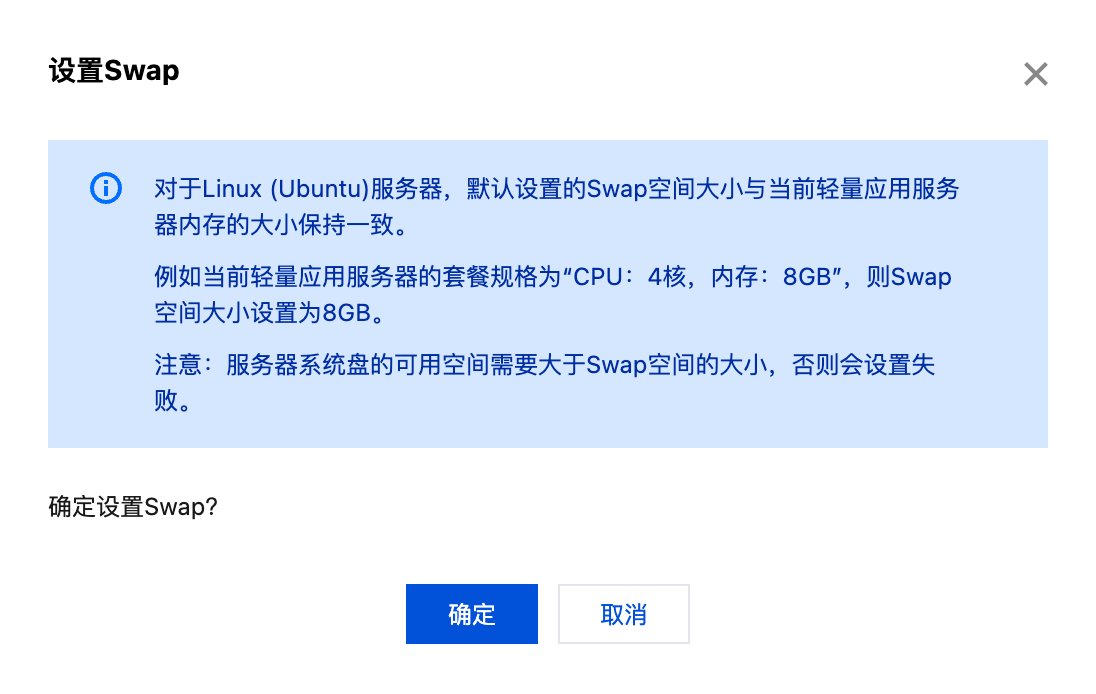 ⚠️注意:服务器系统盘的可用空间需要大于Swap空间最小值,否则会设置失败。