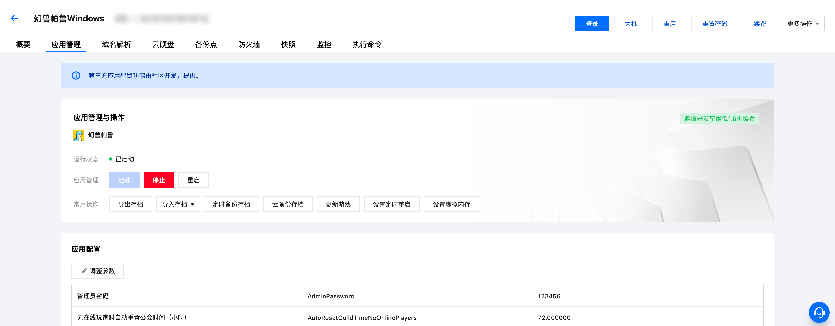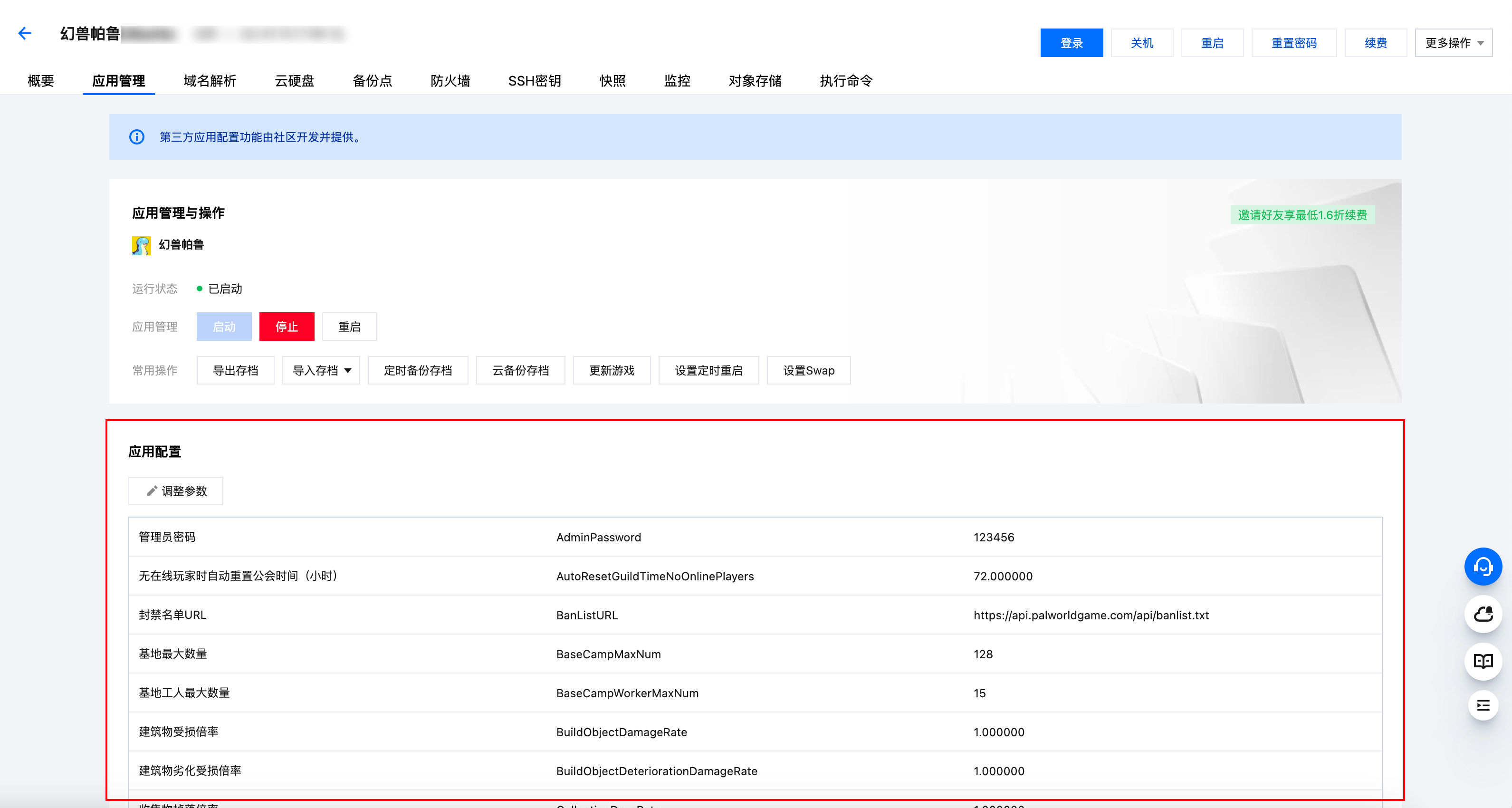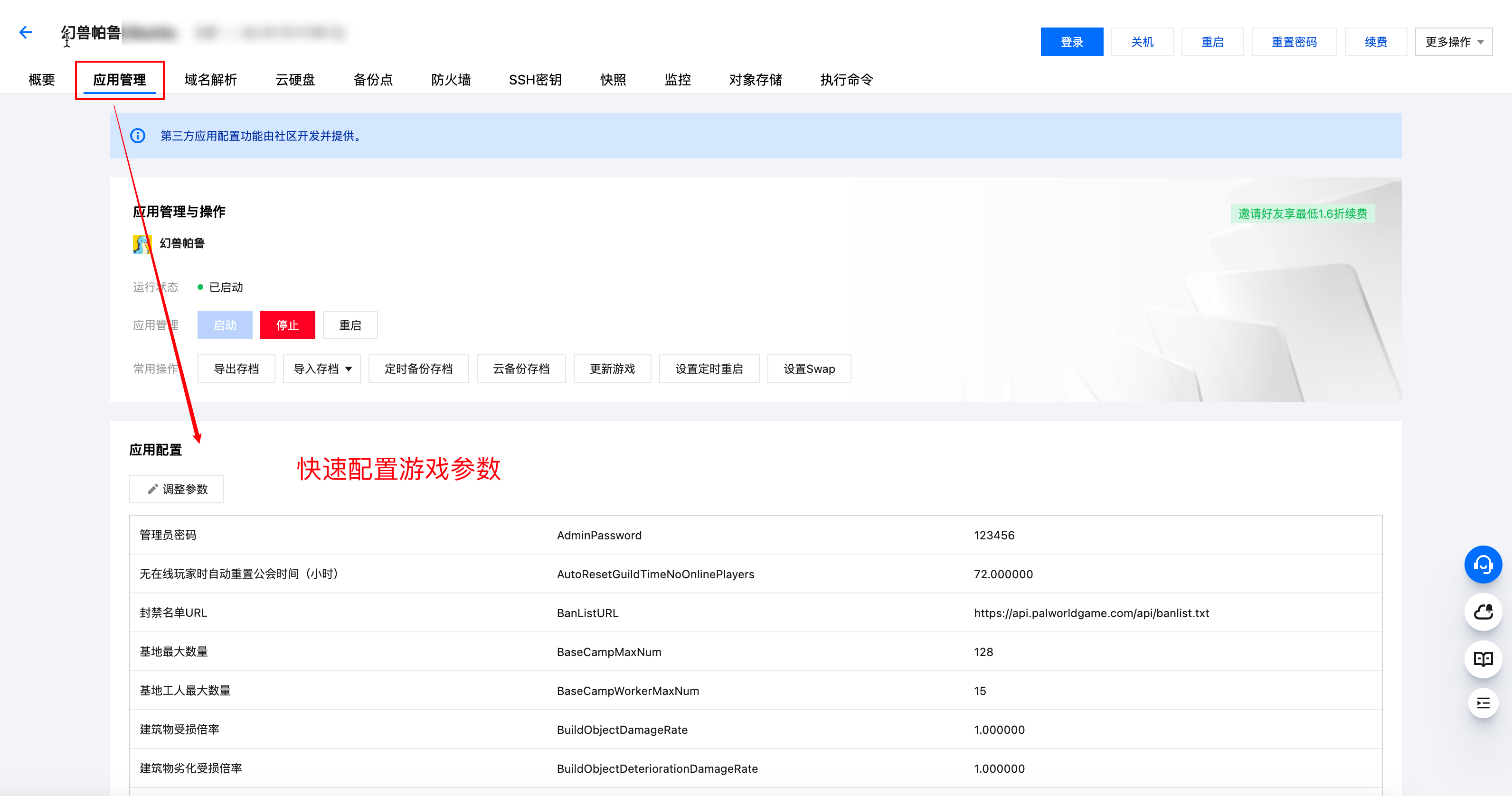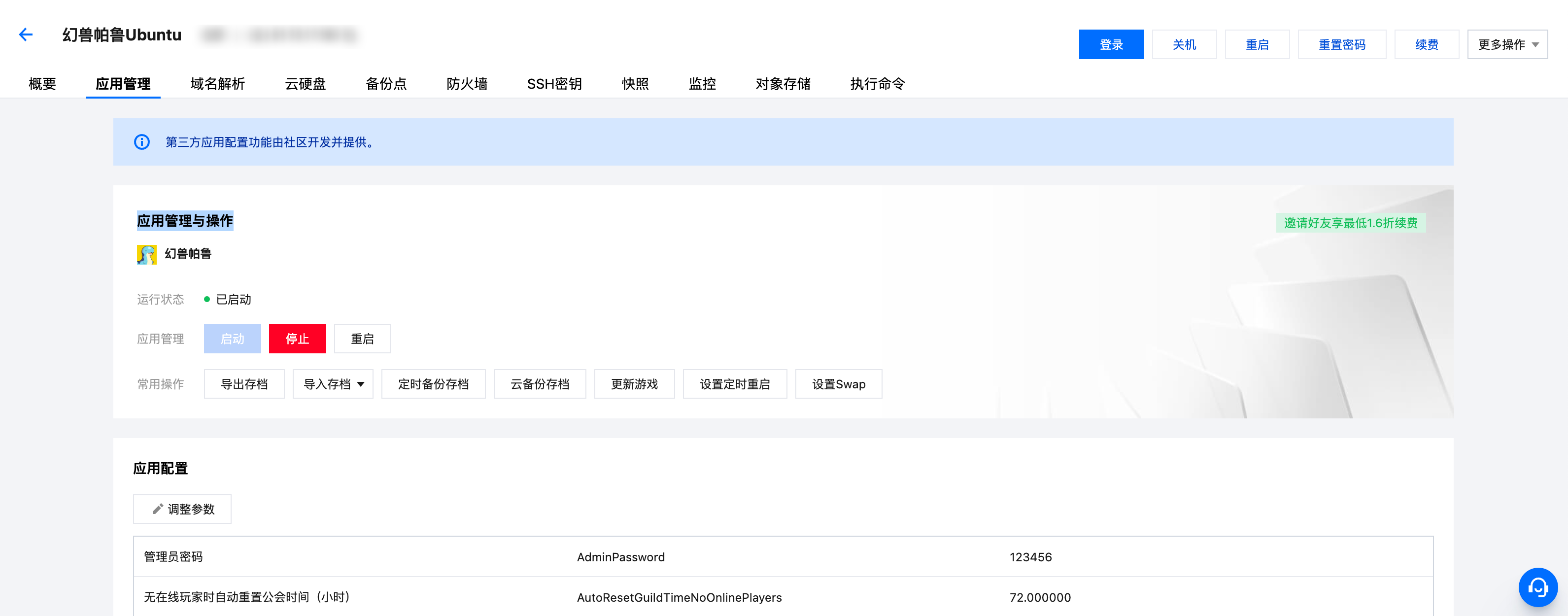 步骤二:在实例详情页点击“应用管理”,即可看到幻兽帕鲁的配置面板。