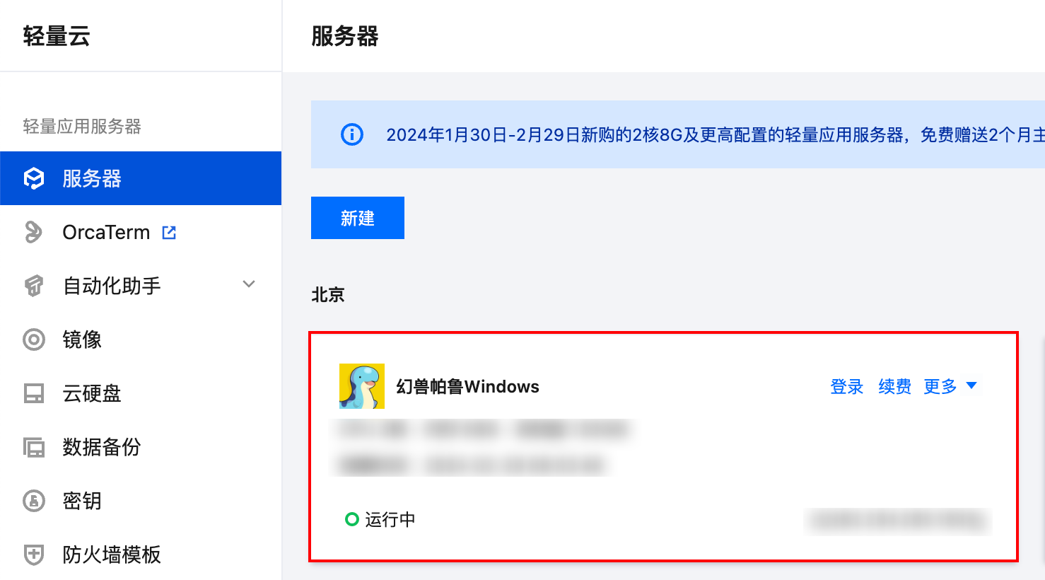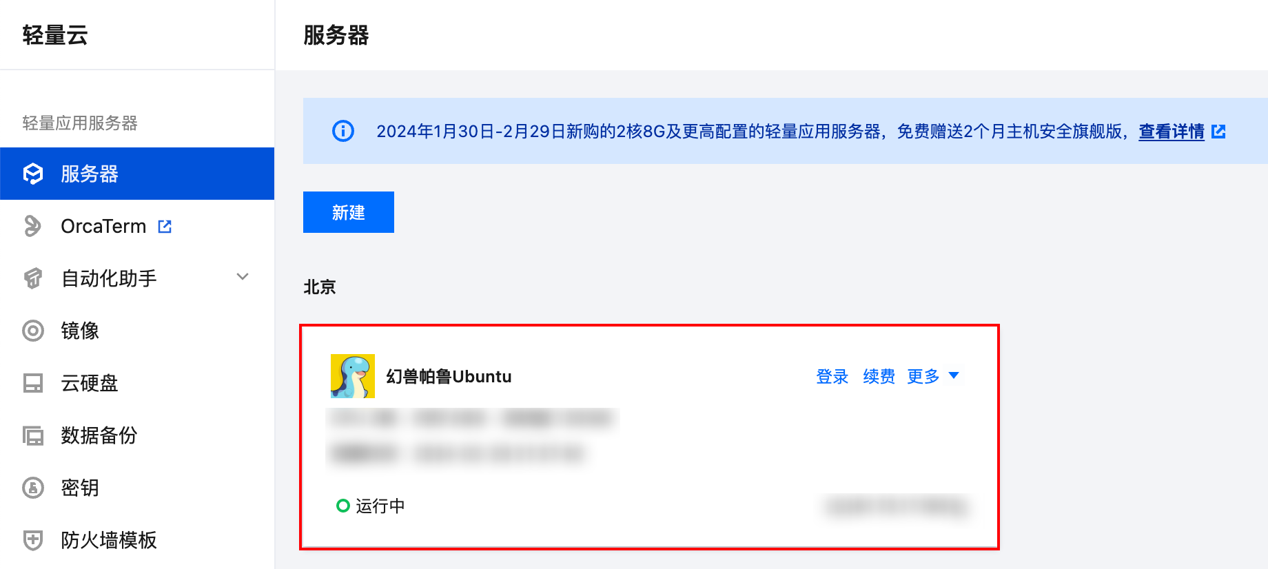 步骤一:登录轻量云控制台,找到部署了幻兽帕鲁的服务器(第三方应用模板:幻兽帕鲁),单击实例卡片进入详情页。