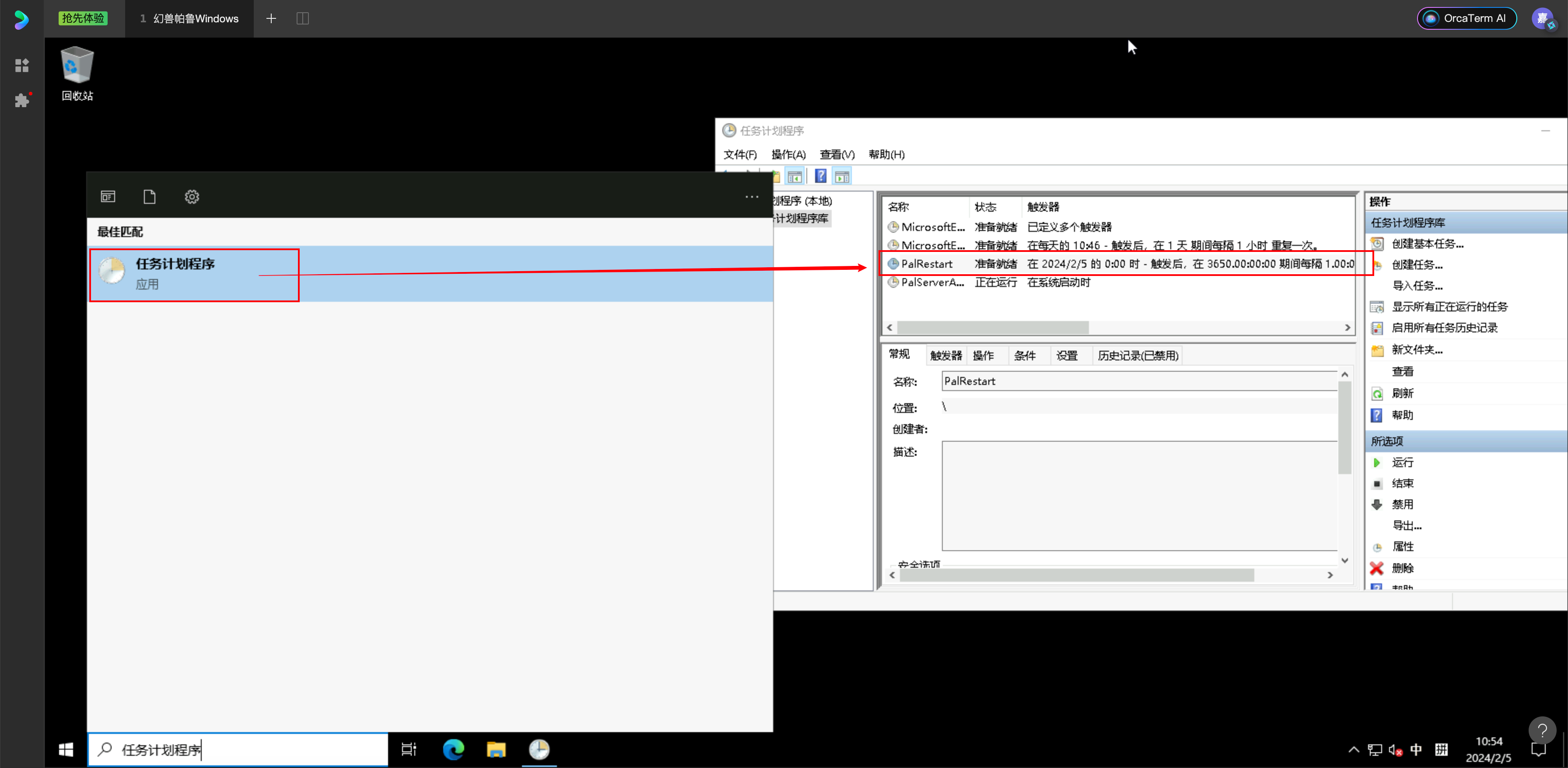 第一步:登录已设置定时自动重启游戏服务的幻兽帕鲁 Windows 服务器,详细操作可以参考官方文档 使用 OrcaTerm终端 远程登录 Windows 实例。登录成功后,在任务栏内的搜索框输入“任务计划程序”,并单击打开。