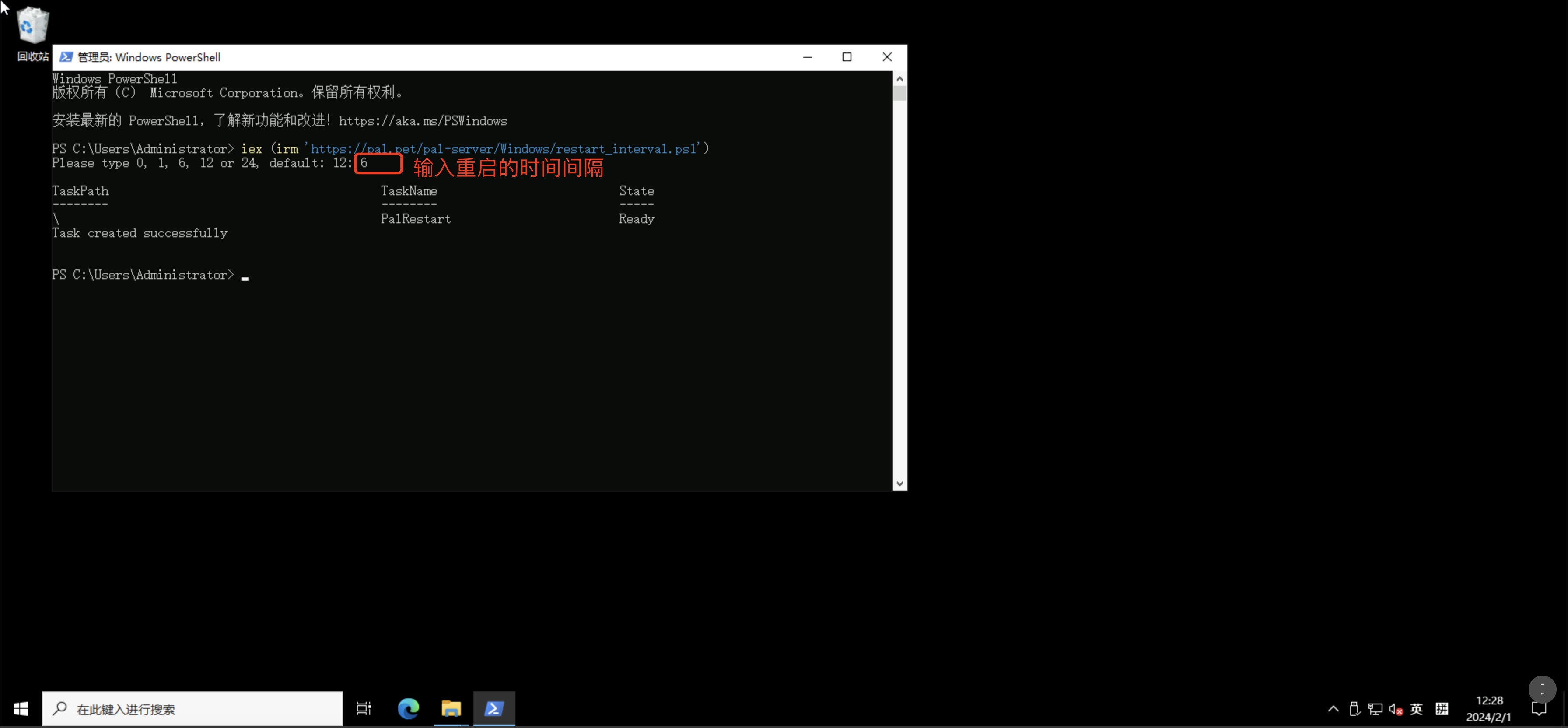 2、在 PowerShell 中运行如下命令,设置定时重启策略,此时需要输入0,1,6,12或24作为重启间隔,输入后单击回车:
