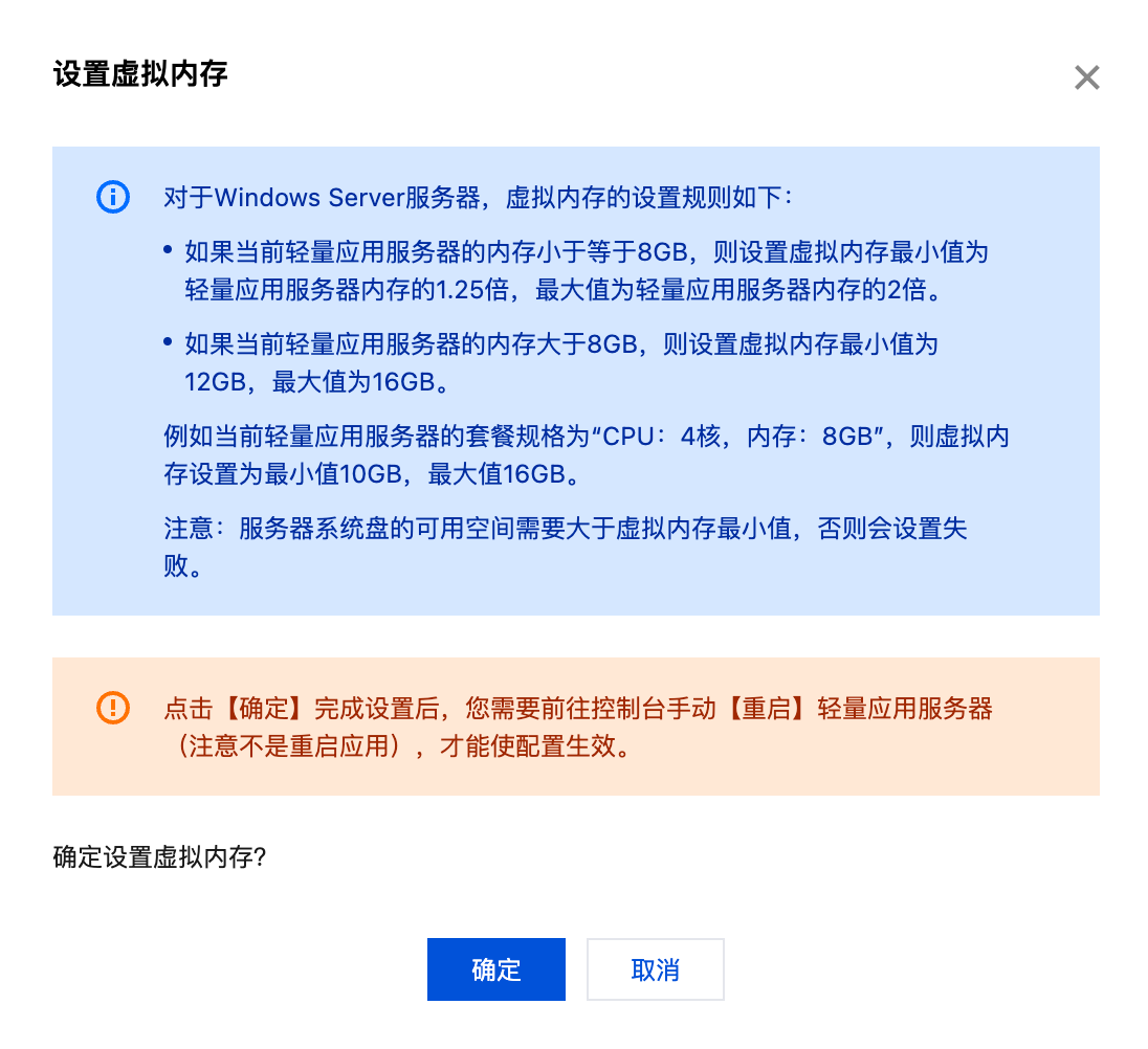 对于Windows Server服务器,虚拟内存的设置规则如下: 1、如果当前轻量应用服务器的内存小于等于8GB,则设置虚拟内存最小值为轻量应用服务器内存的1.25倍,最大值为轻量应用服务器内存的2倍。 2、如果当前轻量应用服务器的内存大于8GB,则设置虚拟内存最小值为12GB,最大值为16GB。 3、例如当前轻量应用服务器的套餐规格为“CPU:4核,内存:8GB”,则虚拟内存设置为最小值10GB,最大值16GB。