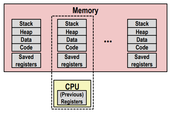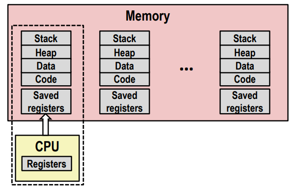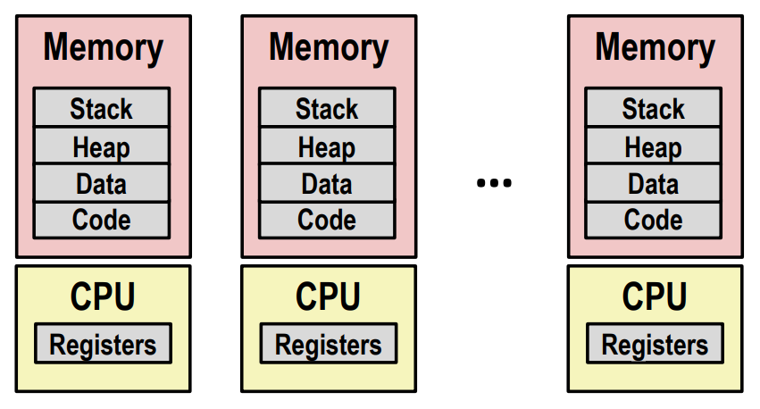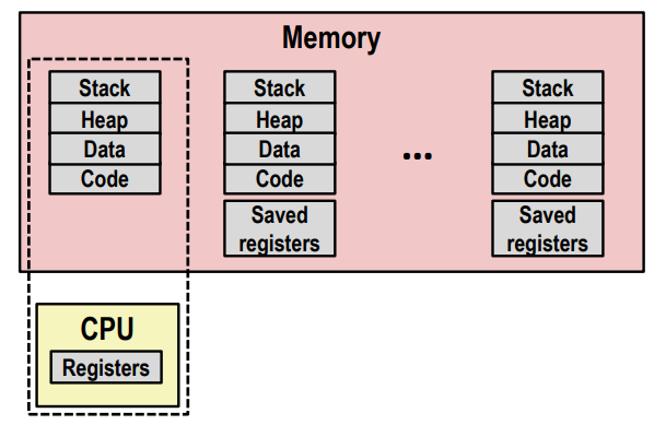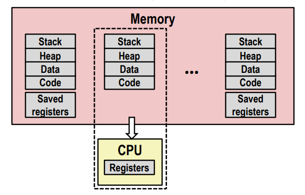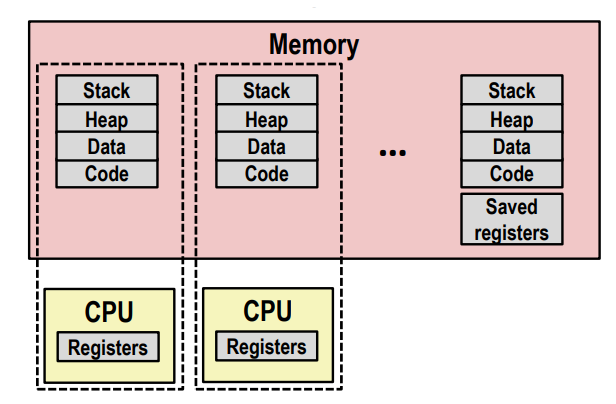 计算机同时运行多个进程,好像每个进程都有一对专用的 CPU 和内存。