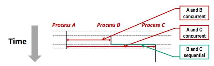 如果两个进程的执行在时间上重叠 (overlap),则两个进程同时运行,称之为 并发 (concurrent)