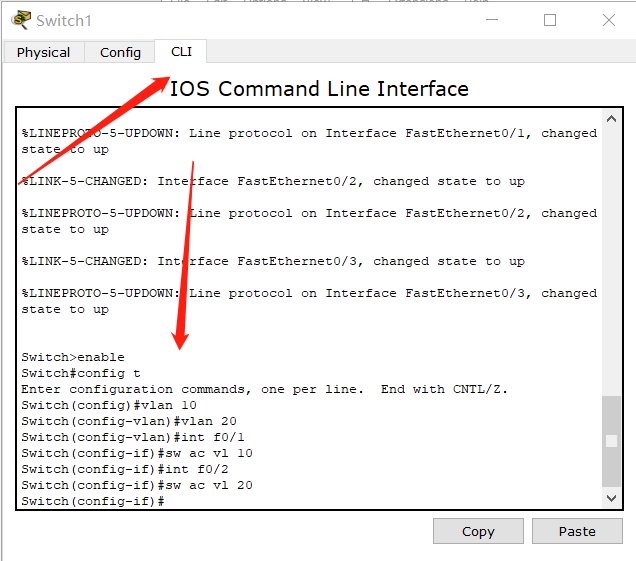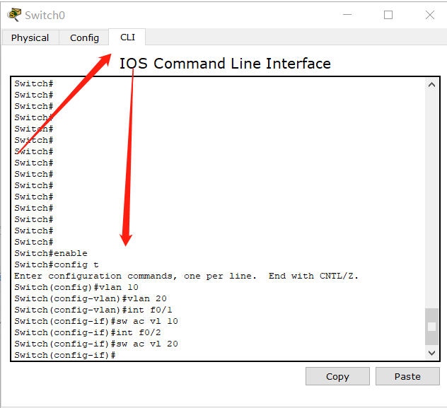 和上一篇文章一样进行划分虚拟局域网,点击交换机使用命令,这次实验将switch0的1号借口和switch1的1号接口放在一个虚拟局域网内,将switch0的2号接口和switch1的2号接口放在一个虚拟局域网内,来进行测试,接下来进行划分,划分的时候注意看自己的实验室将主机连在了交换机的几号接口,显示接口的方法上篇文章有介绍可以看一下。