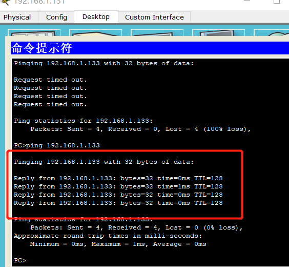 连在不同交换机,在同一虚拟局域网的两台主机通信成功,到这里我们的实验就结束了。如果通信不成功请检查一下划分局域网的时候是否在同一虚拟局域网,通过在两台交换机在特权模式下实验show vlan命令查看对比是否在同一个局域网,如果都在一个局域网还是无法通信,通过show interface trunk命令查看,两台交换机连接的端口是否是两台交换机连接的接口。
