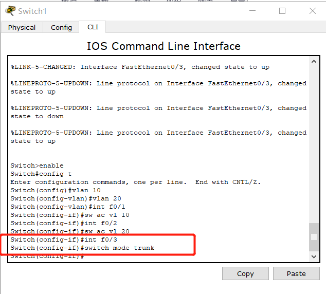 因为需要实现连接在不同交换机上主机之间的通信,需要需要创建TRUNK,需要在两台交换机分别在连接两个交换机的端口用switch mode trunk命令,这个命令是动态创建。