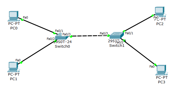 同样我们使用Cisco Packet Tracer Student软件进行模拟搭建,和上篇文章一样拖拽需要的设备到控制台,连接好设备,和上一篇文章实验不同的是,需要两台交换机,两台交换机也需要连接。如下图所示: