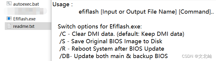 注意2:DOS的更新步骤与上述类似(需要借助软件将U盘刻成DOS启动盘),只是显示出来的文件信息名字没有那么详细,如下图是Efiflash.exe文件,举例说明:进入文件包后,输入命令 Efiflash.exe C246MWU4.F4e后回车即可进入更新模式。