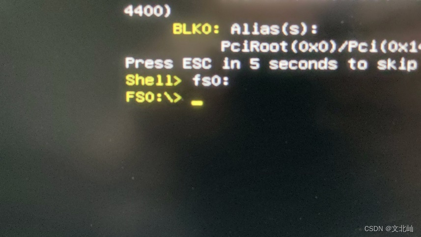 2、在不接入别的硬盘设备的情况下,默认FS0是U盘设备,因此输入fs0: 后回车: