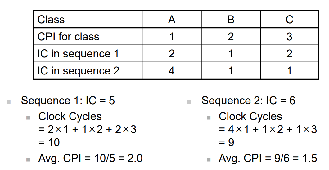 程序的指令计数是由程序本身、指令集架构 (ISA) 和编译器所决定的。每个指令的平均时钟周期数取决于CPU硬件。如果不同的指令具有不同的CPI,则平均 CPI 受指令组合的影响。