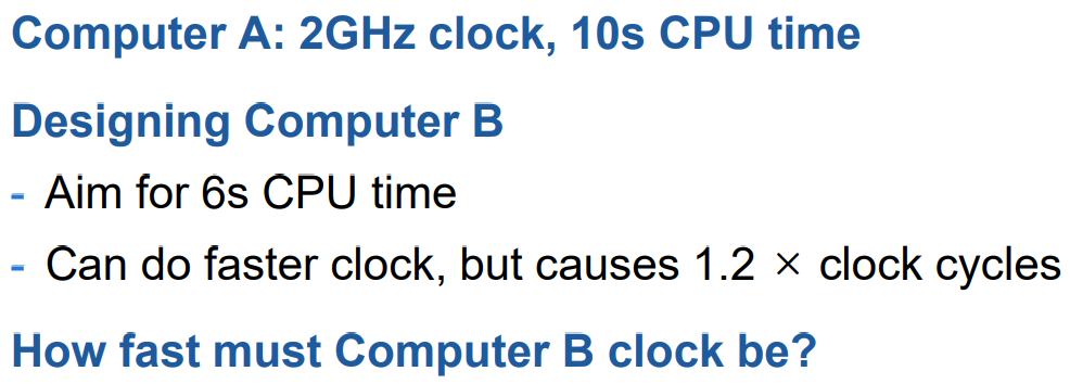 计算机 A 有 2GHz 的时钟, 10s 的CPU 时间,请设计计算机 B,目标达到 10s 的 CPU 时间。可以使用更快的时钟,但会导致 1.2 × 时钟周期,问计算机 B 的时钟应该多快?