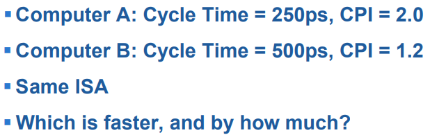 计算机 A 的周期时间 = 250ps,CPI = 2.0,计算机 B 的周期时间 为 500ps,CPI = 1.2