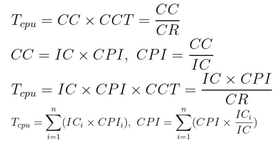 性能取决于 算法 (影响 IC,可能影响 CPI)、编程语言 (影响 IC,CPI)、编译器(影响 IC,CPI)、指令集架构(影响 IC,CPI,Tc)。