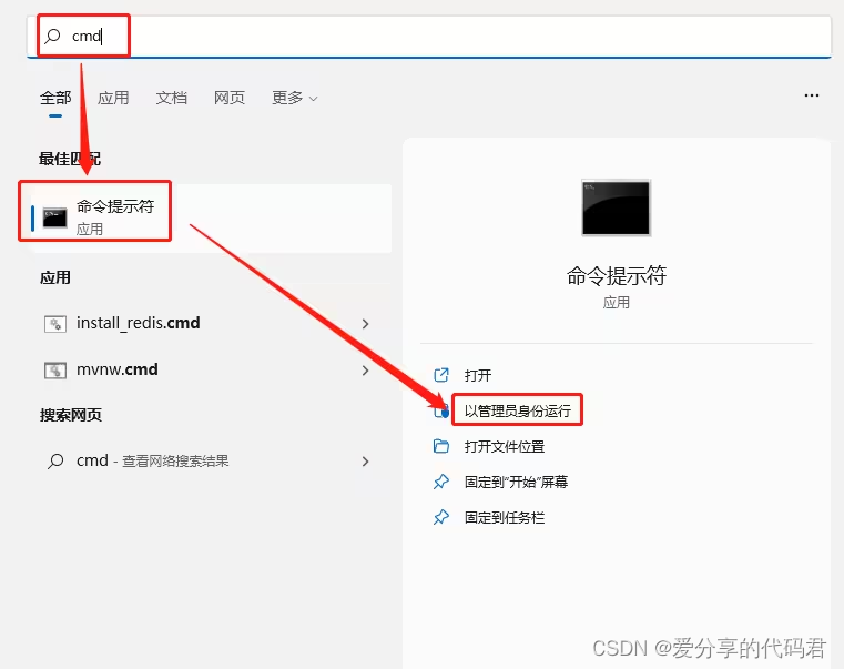 按win+s,在搜索中输入cmd,在右侧点击“以管理员身份运行”