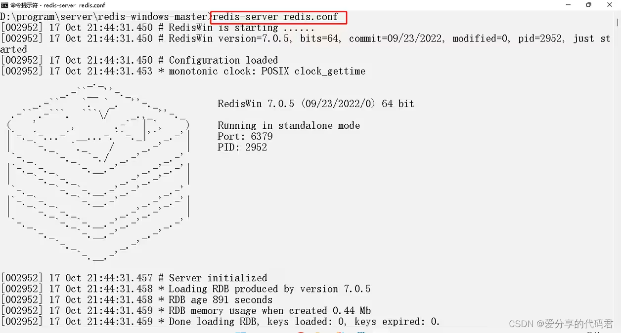 2)在命令行输入"redis-server redis.conf”,其中“redis.conf”为解压目录下的配置文件。