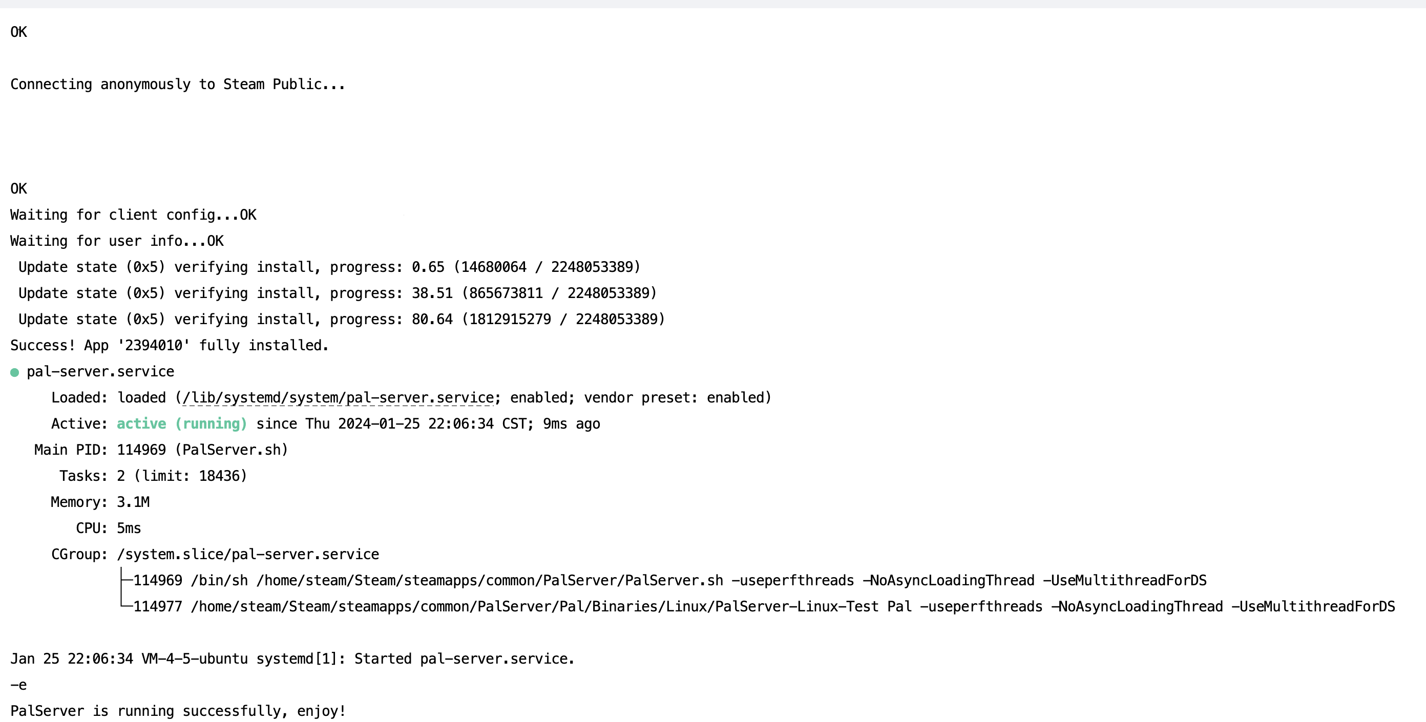4、等待命令执行成功(约3-5分钟),即可完成幻兽帕鲁服务器部署。