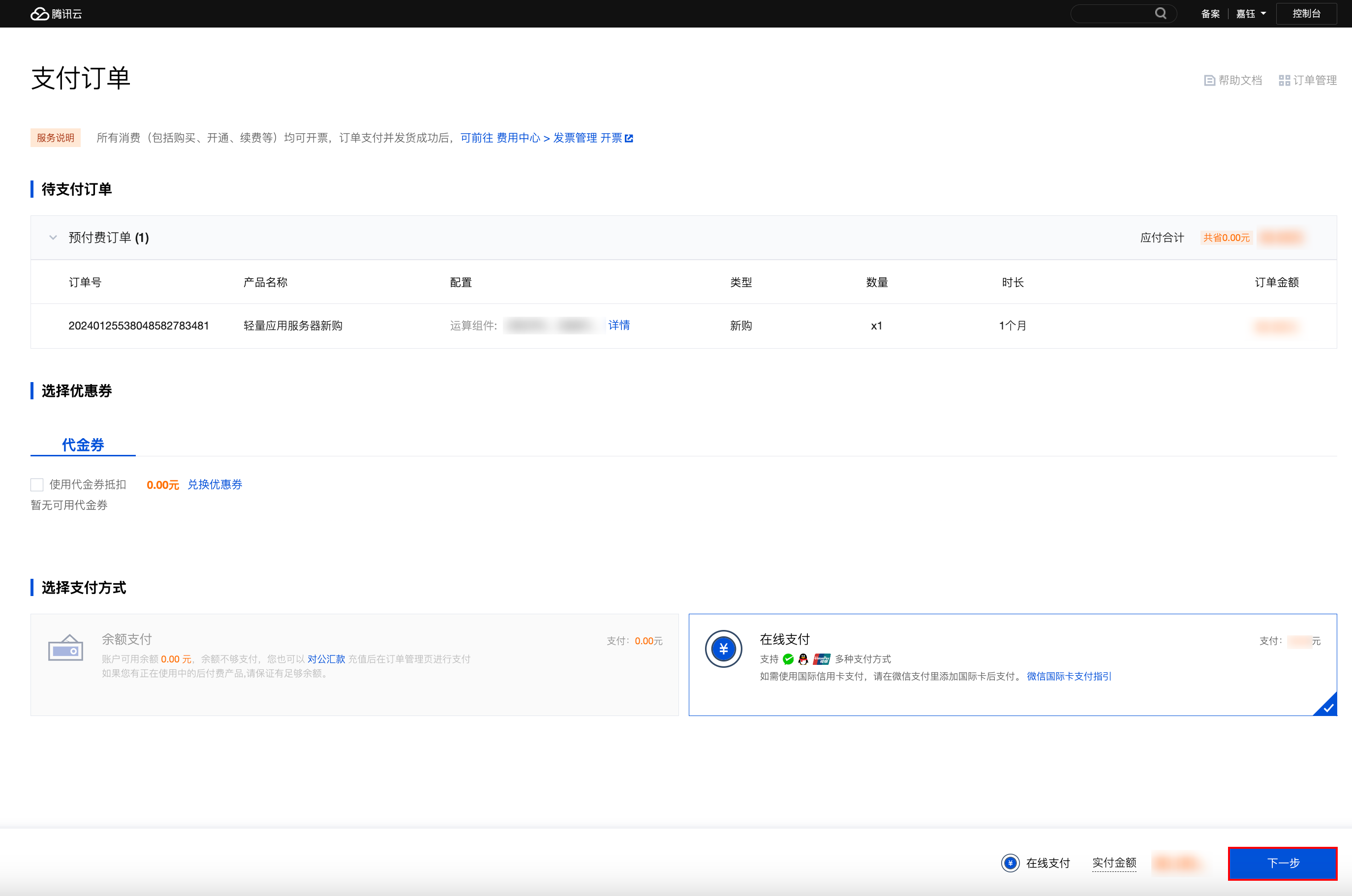6. 您可选择使用余额或在线支付。如您选择在线支付,则需要点击下一步。