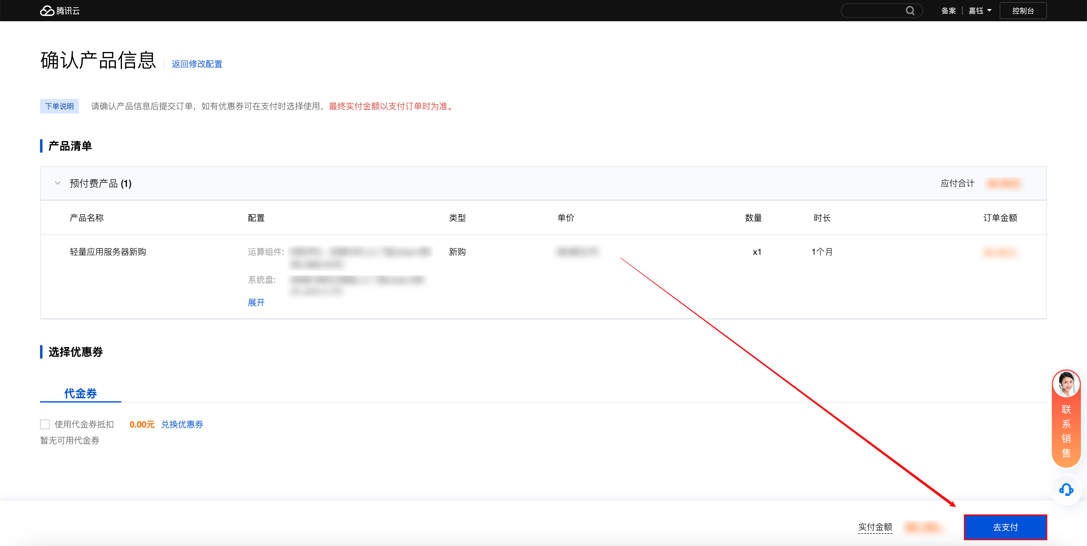 5. 确认产品信息,并在页面右下角点击“去支付”。