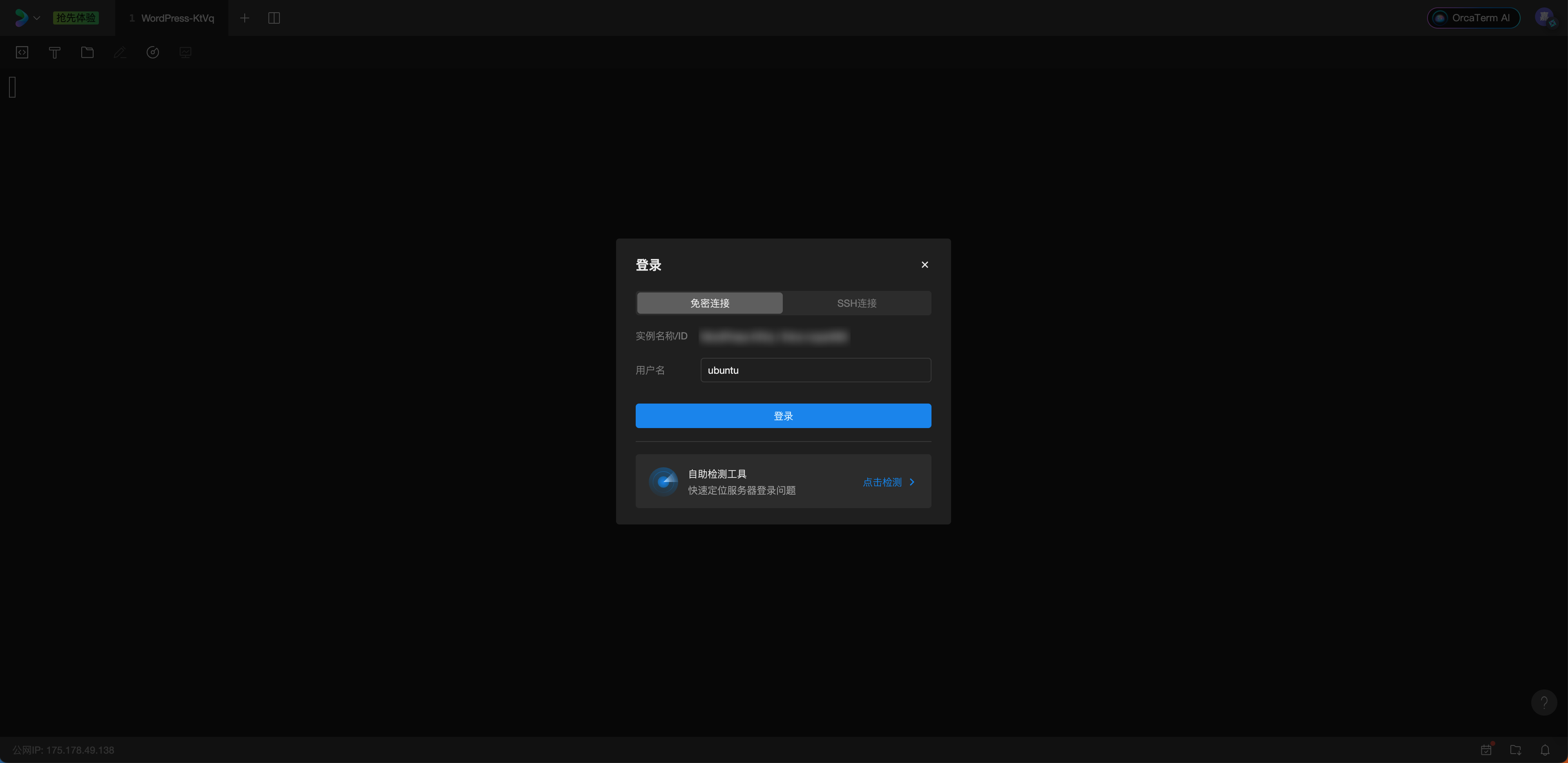 登录腾讯云轻量应用服务器控制台。选中服务器实例,点击登录按钮,推荐使用免密登录,您无需密码即可登录。