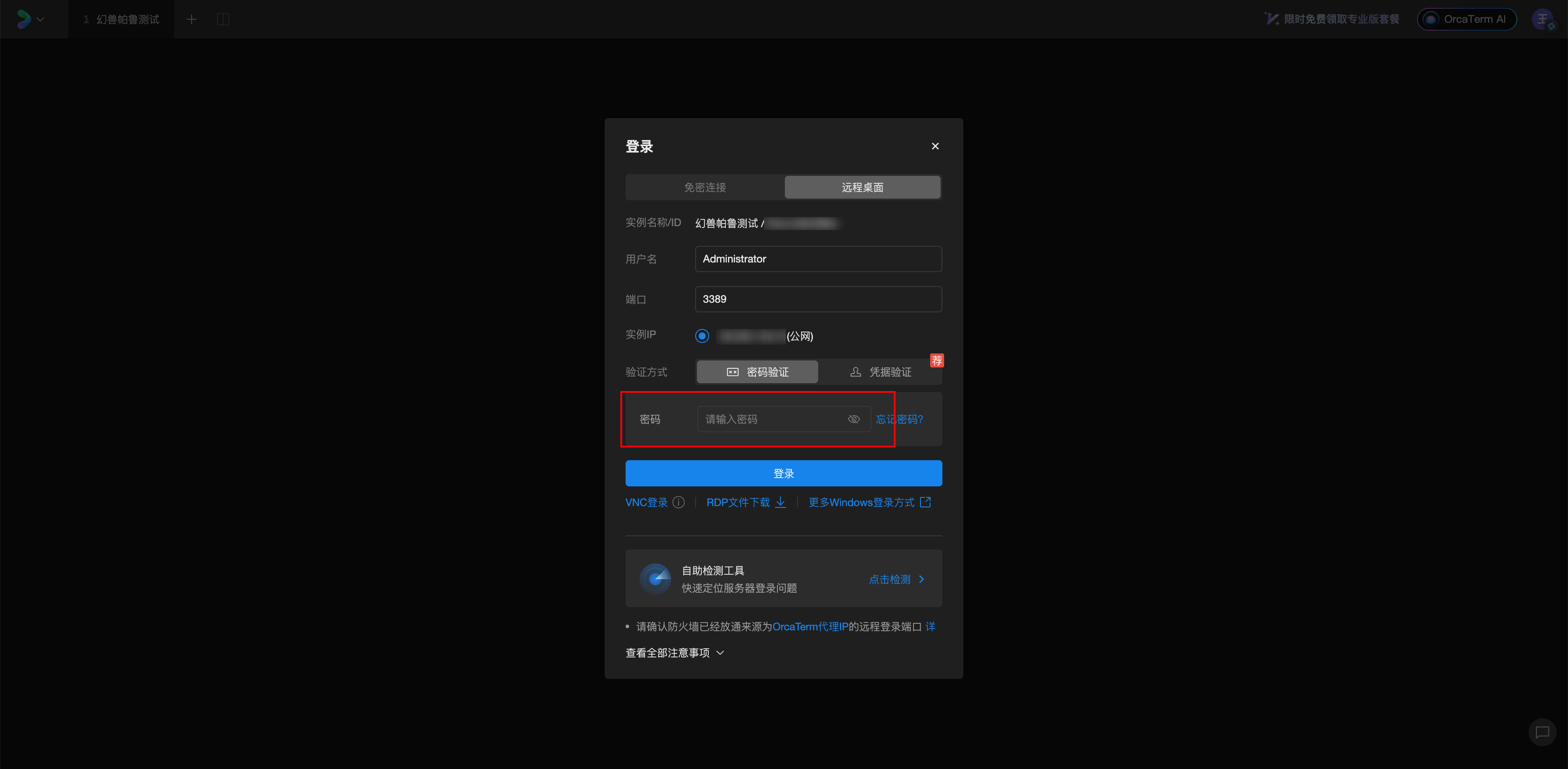 2、选中服务器实例,点击【登录】按钮,并在登录页面输入登录密码即可。