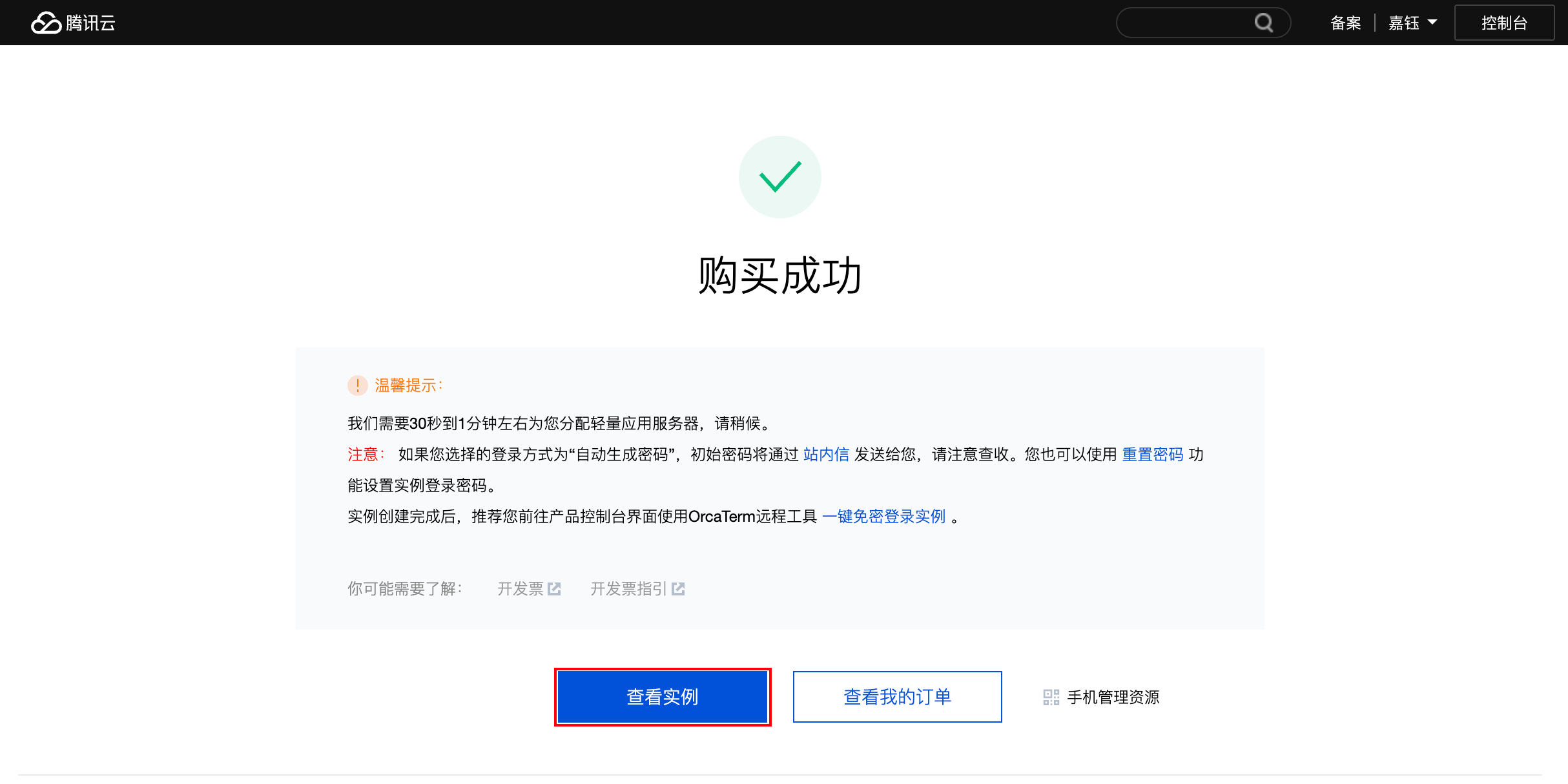 7. 支付成功后,您将来到支付成功页,点击“查看实例”,即可前往轻量应用服务器控制台查看刚刚购买的服务器。