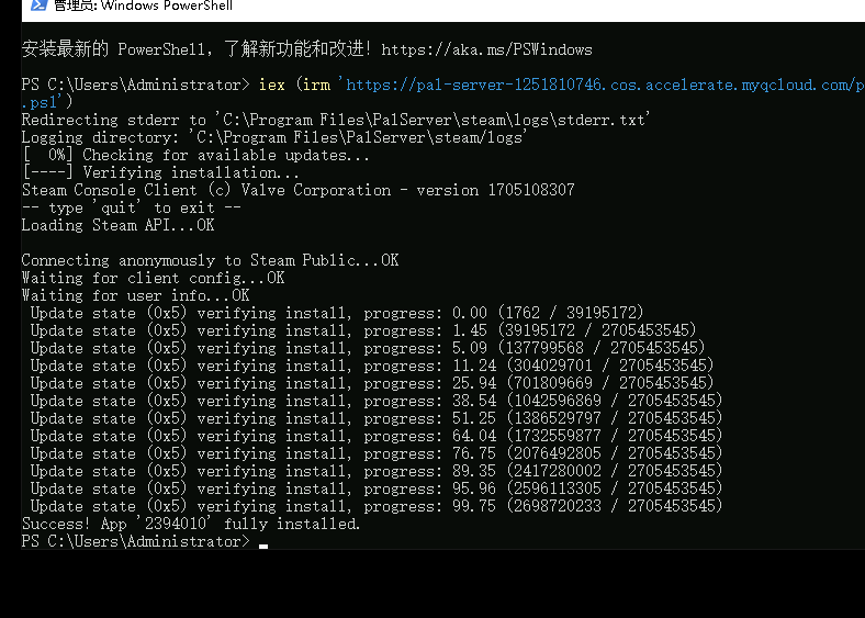 iex (irm 'https://pal-server-1251810746.cos.accelerate.myqcloud.com/pal-server/Windows/update.ps1') ⚠️注意:如果遇到“Retry Failed”等错误提示,请重新运行以上命令直到出现下图的内容:fully installed