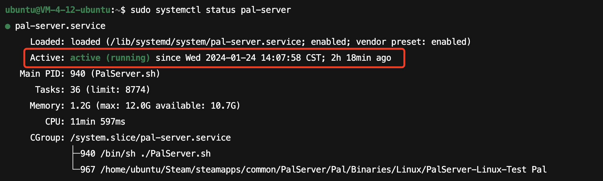 一键部署脚本执行成功后,会在服务器中创建一个名为pal-server的服务,您可以使用如下命令检查服务是否正常启动,如出现图示的效果,则证明服务器已经部署成功。
