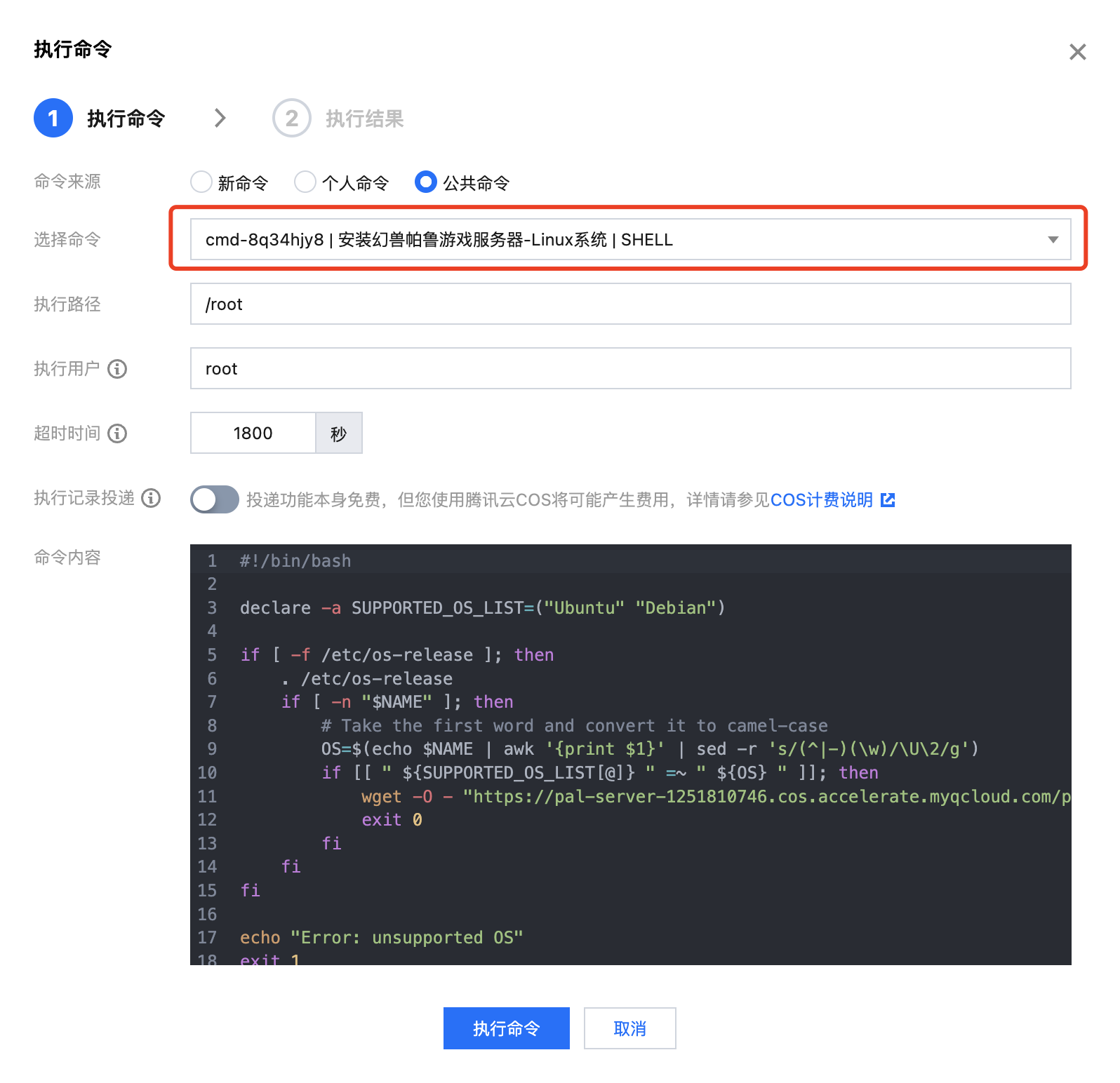 3、在执行命令的弹窗中,选择【公共命令】,并根据服务器操作系统的类型,下拉选择需要执行的命令。